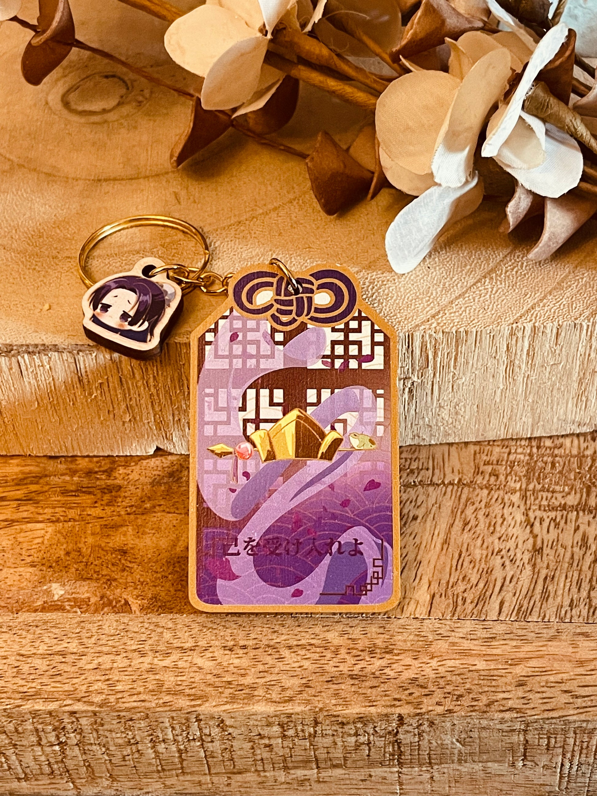 Ogni omamori è realizzato su legno, con illustrazione originale firmata Chlexart, e nasconde all’interno una piccola frase simbolica, pensata per trasmettere l’essenza del personaggio rappresentato: