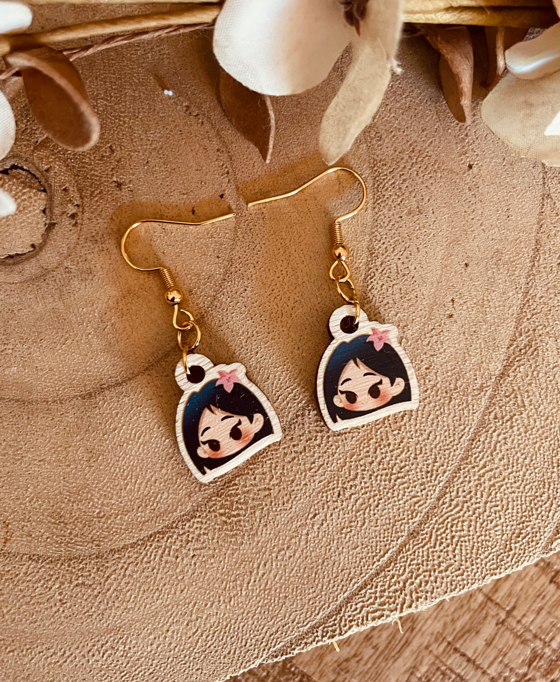 Questi orecchini sono leggeri e delicati, composti da un ciondolo in legno illustrato digitalmente di circa 1,5cm. La monachella e gli anellini sono in acciaio dorato anallergico, perfetti anche per le pelli più sensibili.