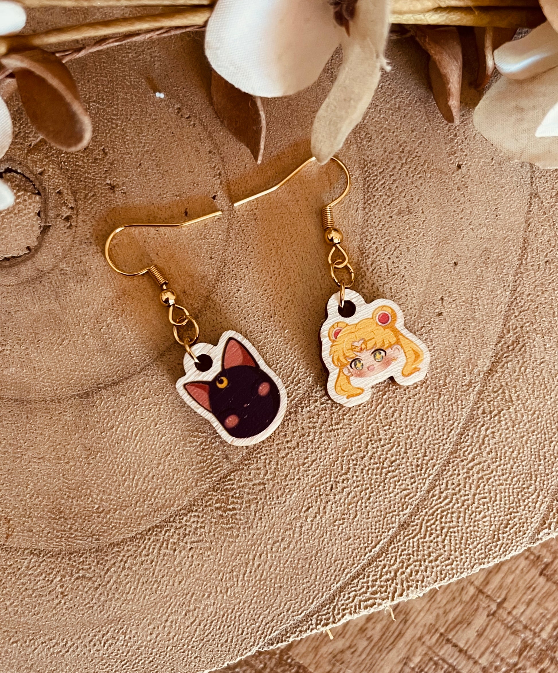 Questi orecchini sono leggeri e delicati, composti da un ciondolo in legno illustrato digitalmente di circa 1,5cm. La monachella e gli anellini sono in acciaio dorato anallergico, perfetti anche per le pelli più sensibili.