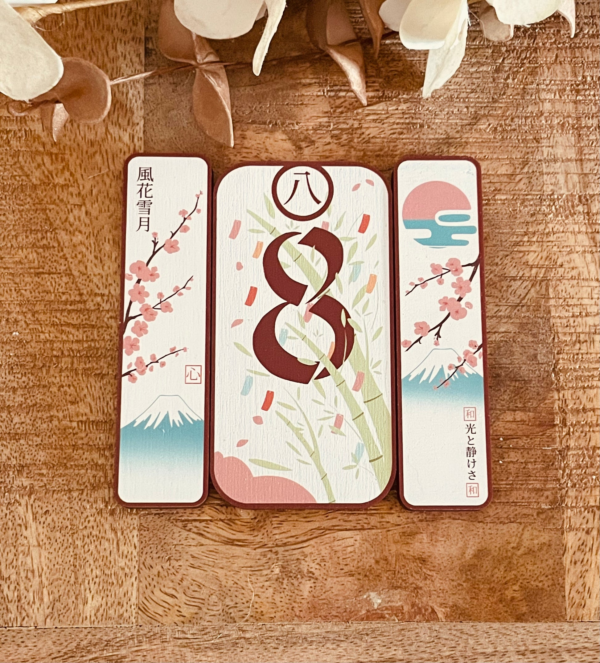Un numero centrale incorniciato da due tasselli laterali decorati con illustrazioni giapponesi. L’effetto finale è armonioso e simmetrico, perfetto per chi desidera un tocco in più.
