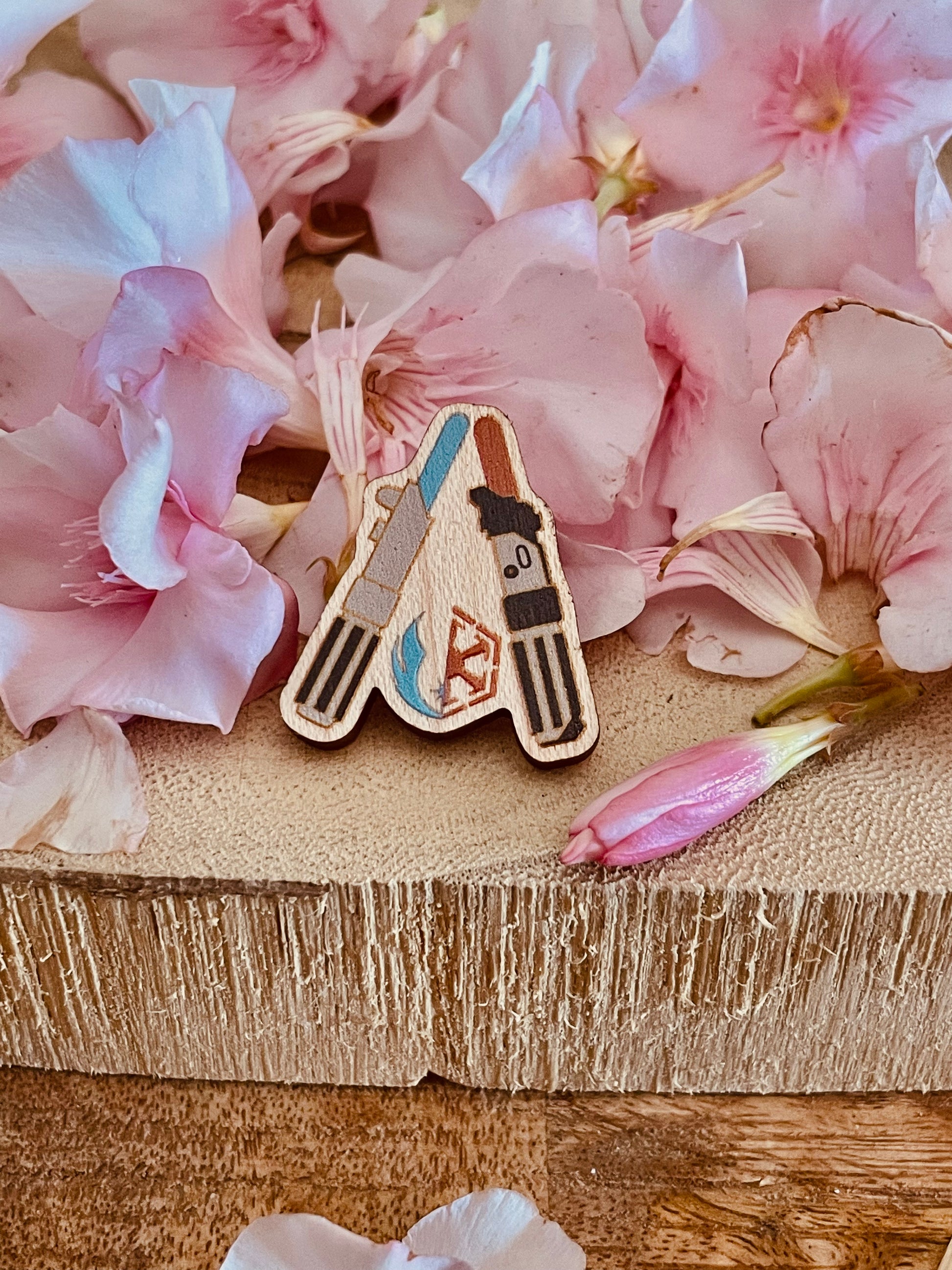 Ogni spilla è stampata su legno naturale spesso 4 mm e misura circa 3 cm: leggera ma resistente, perfetta da applicare su borse, zaini o giacche .